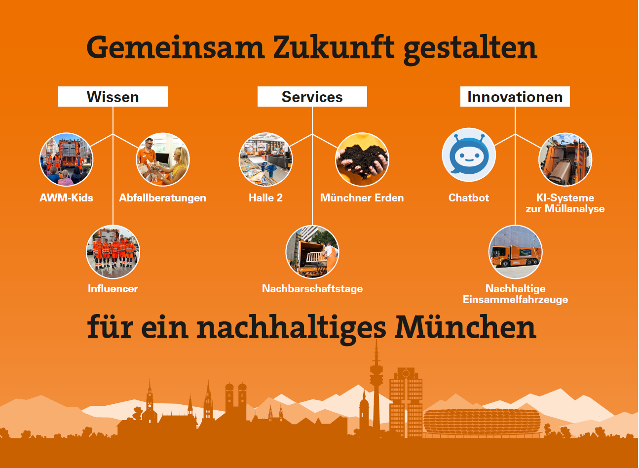Als innovativer, bürgernaher und verantwortungsbewusster Akteur gestaltet der AWM die Zukunft der städtischen Abfallwirtschaft. Hier erfahren Sie, wie aus Abfall neue Werte entstehen: In den drei zentralen Themenbereichen Marketing und Kommunikation, Innovation sowie Services für München zeigt der AWM anhand konkreter Beispiele wie Umweltbildung, moderne technische Lösungen und bürgerfreundliche Angebote ineinandergreifen und gemeinsam dazu beitragen, Abfall zu vermeiden, Ressourcen zu schonen und nachhaltiges Handeln im Alltag zu fördern.